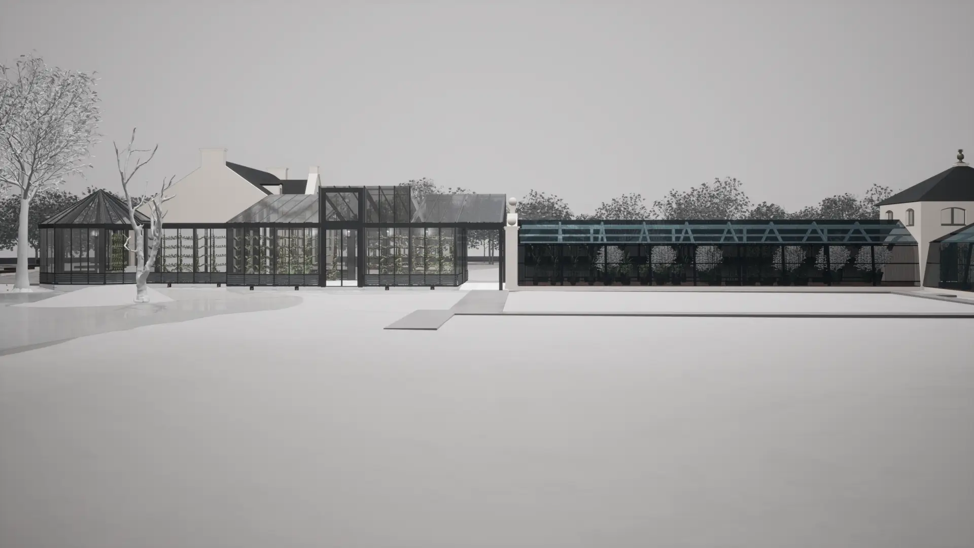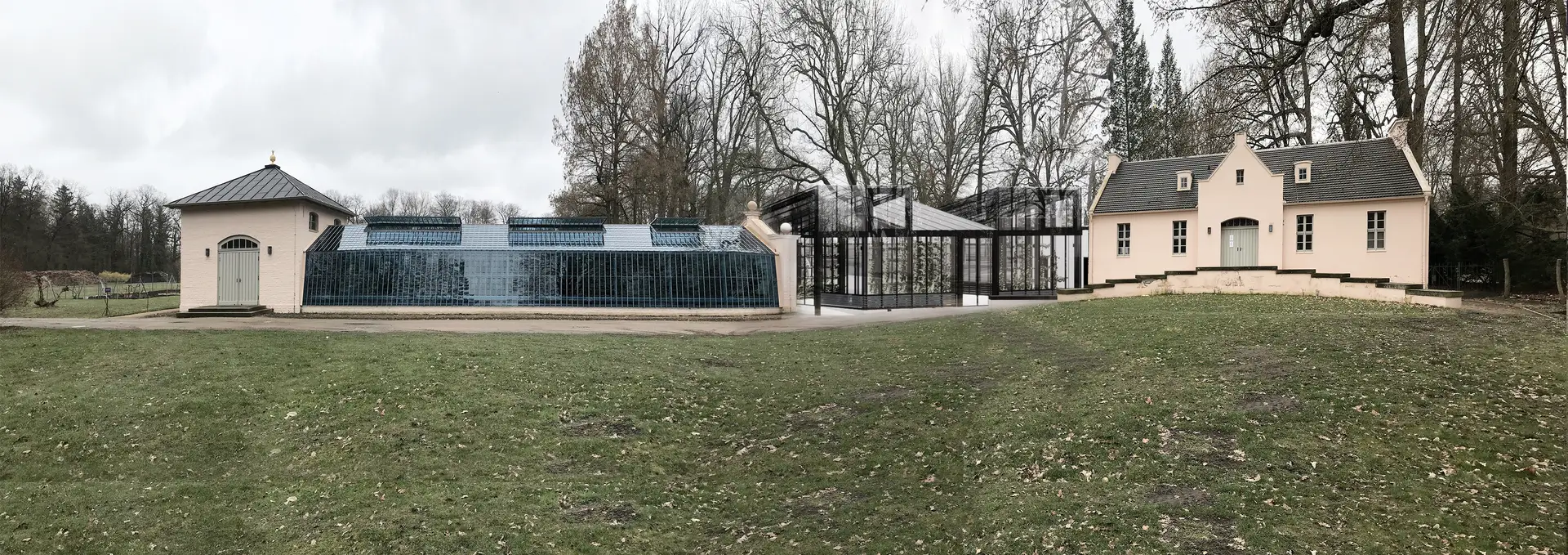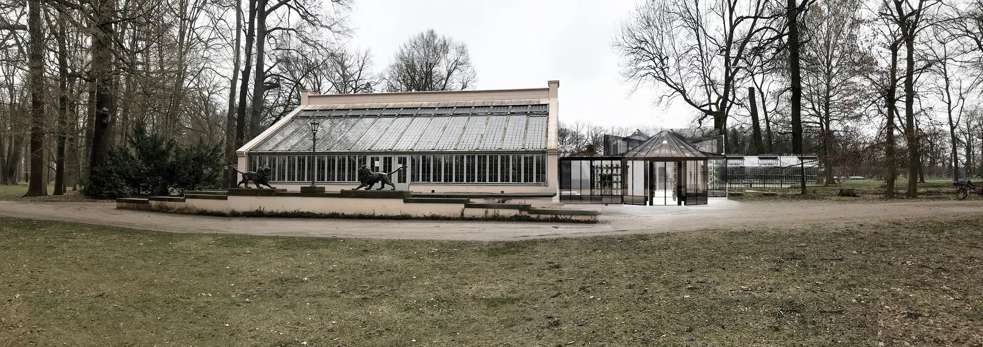 The grid structure of the façade can be partially identified in the historical sketches. The new steel-and-glass construction continues this fine traditional column layout and incorporates it into a secondary façade layer in the form of an internal metal framework. Along this inner layer of the façades of the Vermehrungshaus and the corridors, vine plants will grow. For this purpose, a network of steel cables will be installed, positioned about half a meter away from the supports. The arrangement of the plants along the façade follows the historical model. These plants will provide natural shading in summer and improve the indoor climate. Large opening elements on both sides will allow the Vermehrungshaus to open toward the Blumensee and the café garden.