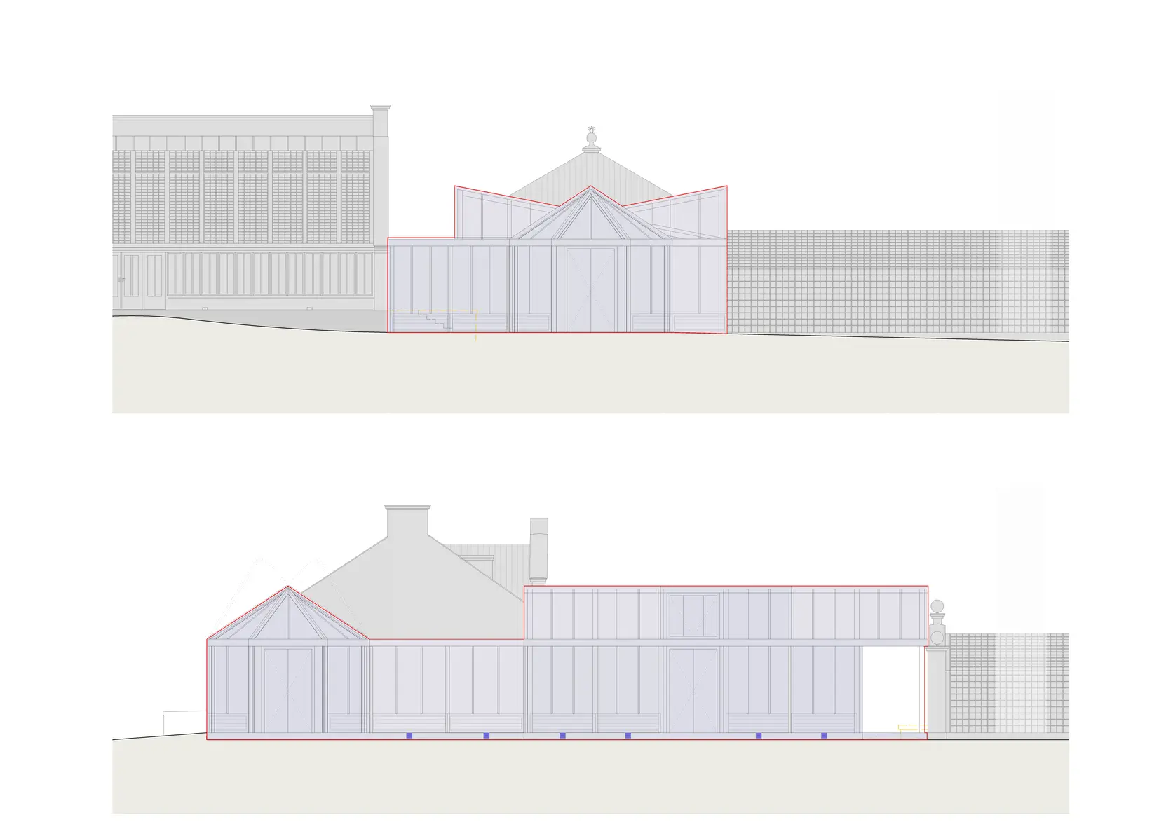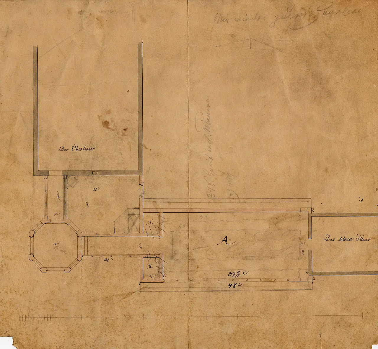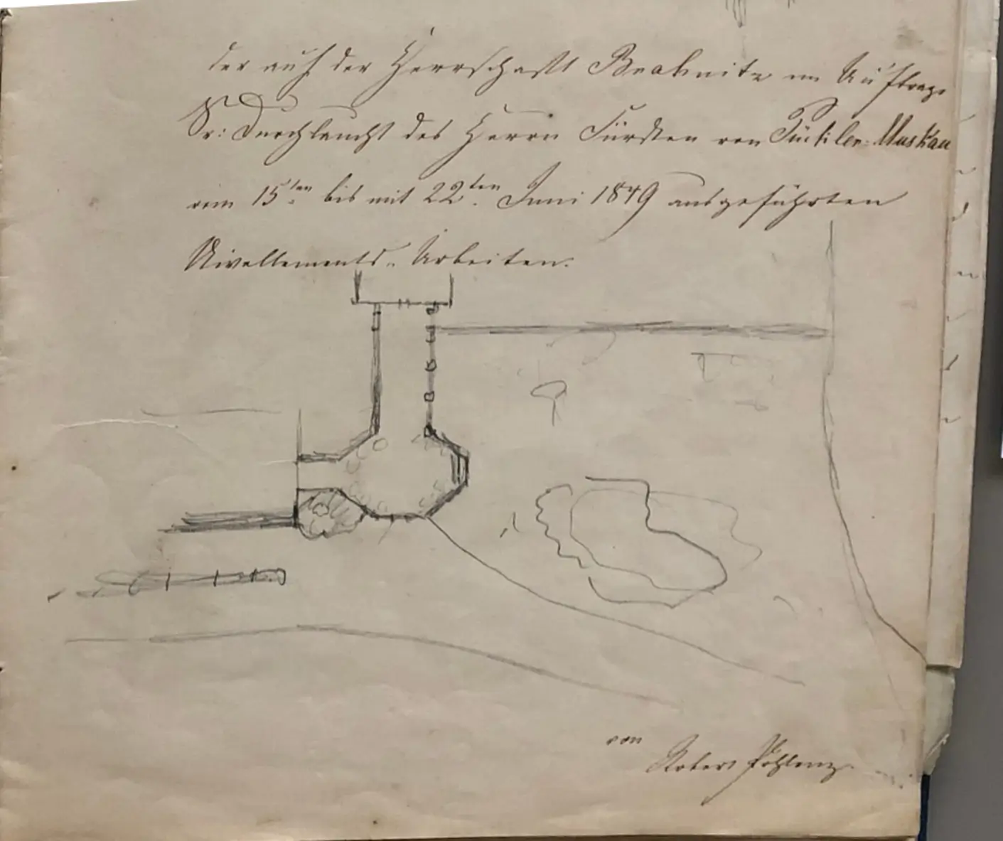 On the initiative of the Stiftung Fürst-Pückler-Museum Park und Schloss Branitz, the monument ensemble in Branitz Park, consisting of the Oberhaus, Blaues Haus, Kuppelhaus, and Ananashaus, is to be expanded to include the Blumenpavillon and the Vermehrungshaus. The octagonal Blumenpavillon and the Vermehrungshaus, which connect to the Blaues Haus, are based on sketches by Fürst Pückler himself. By uncovering the historical foundation structure, it was confirmed that the proposed design corresponds in position to the original Blumenpavillon.