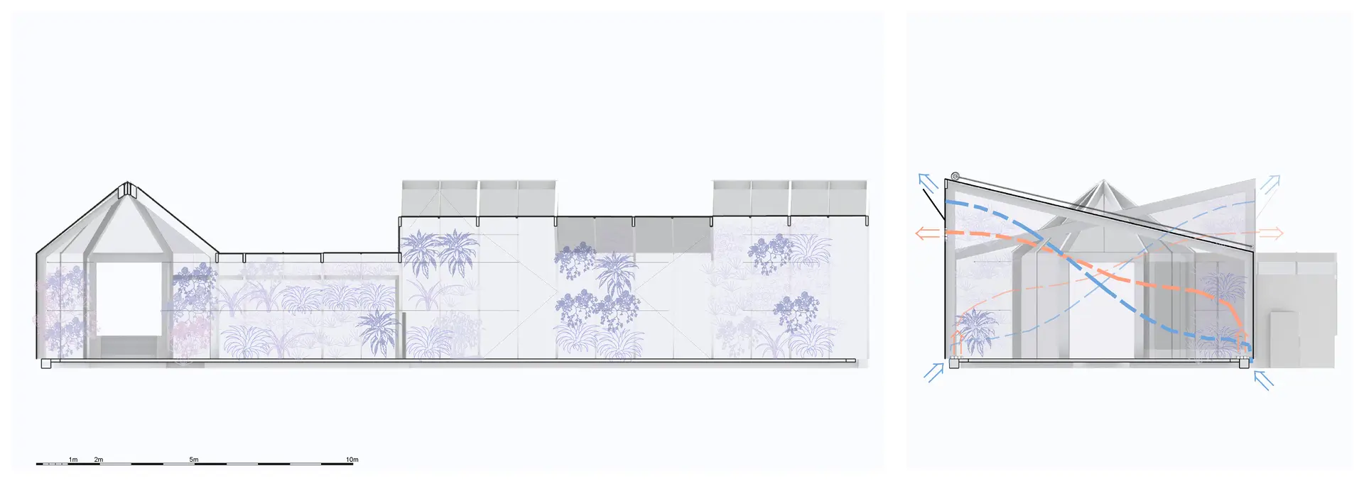 Summer heat protection will be ensured not only by the natural shading of the vines but also by internal energy screens positioned directly beneath the roof surface. Natural ventilation will occur through a continuous joint at the base and ventilation elements in the upper sections of the vertical glazing. The articulated roof form of the Vermehrungshaus allows for optimized cross-ventilation through staggered roof peaks. Building services are kept to the essential minimum.