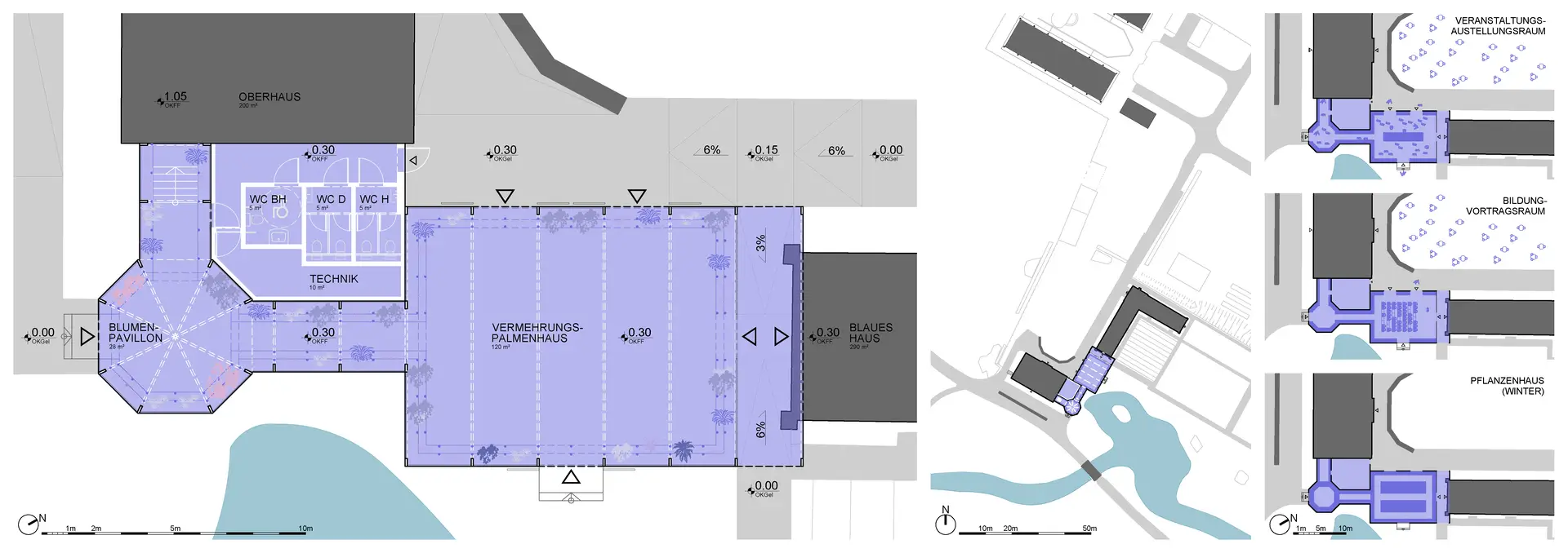 The Blumenpavillon, the connecting corridors, the Vermehrungshaus, the sanitary area, and the Blaues Haus are all situated on one level and are accessible by all. The connection to the Oberhaus is provided internally via a staircase, while an external route ensures barrier-free access. At the entrances to the Blumenpavillon and the Vermehrungshaus, the transition from the surrounding terrain to the interior is designed to be step-free. In the service area, an accessible restroom is accessible from outside.