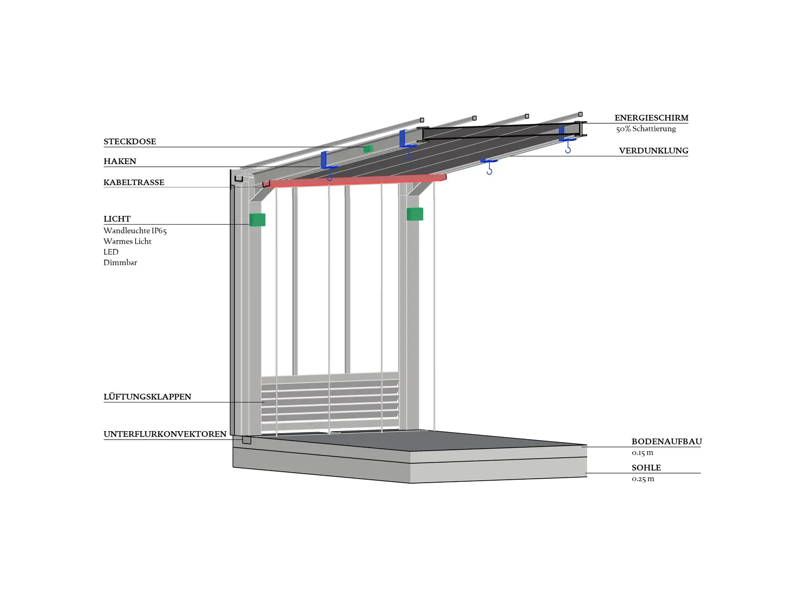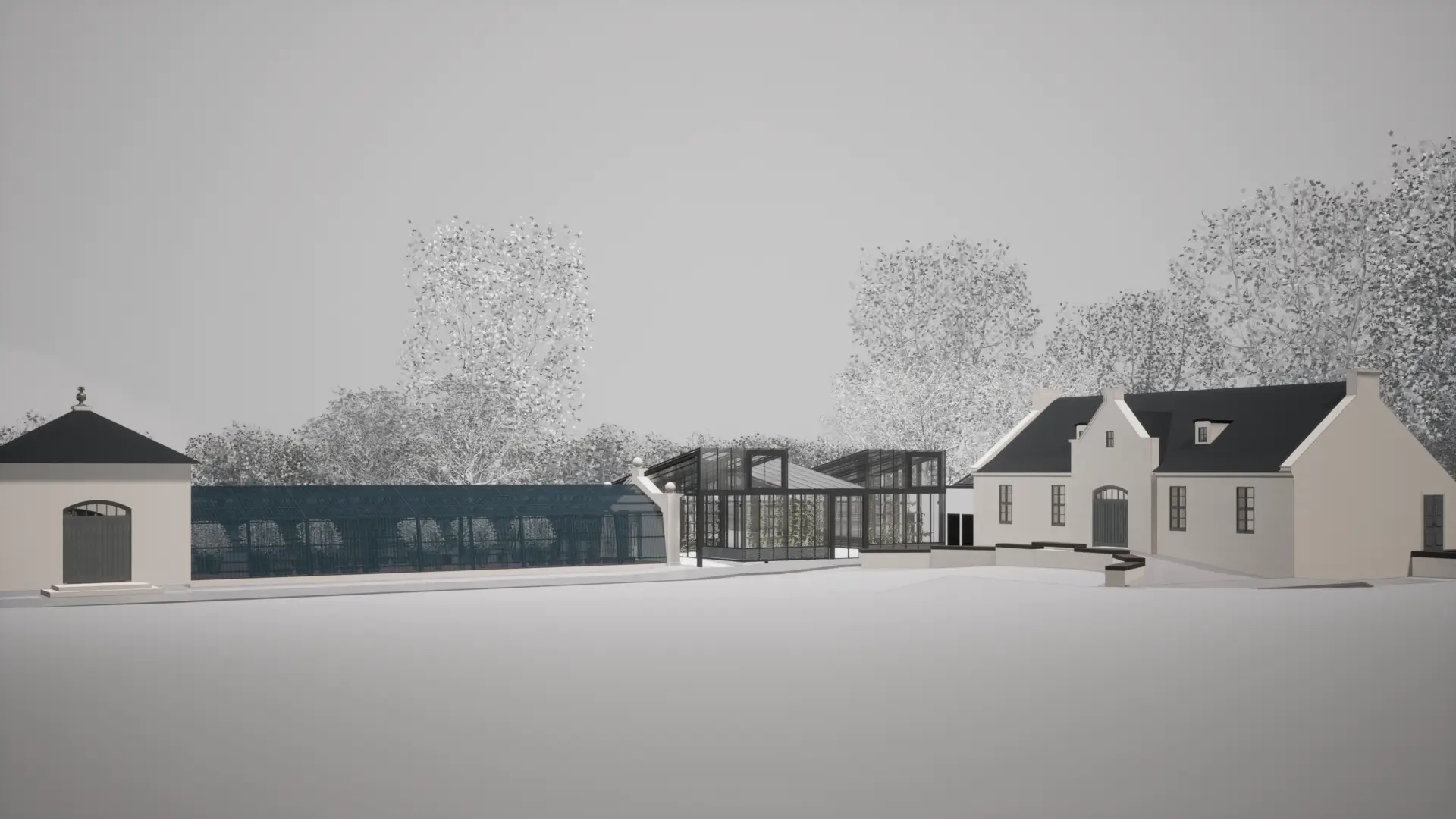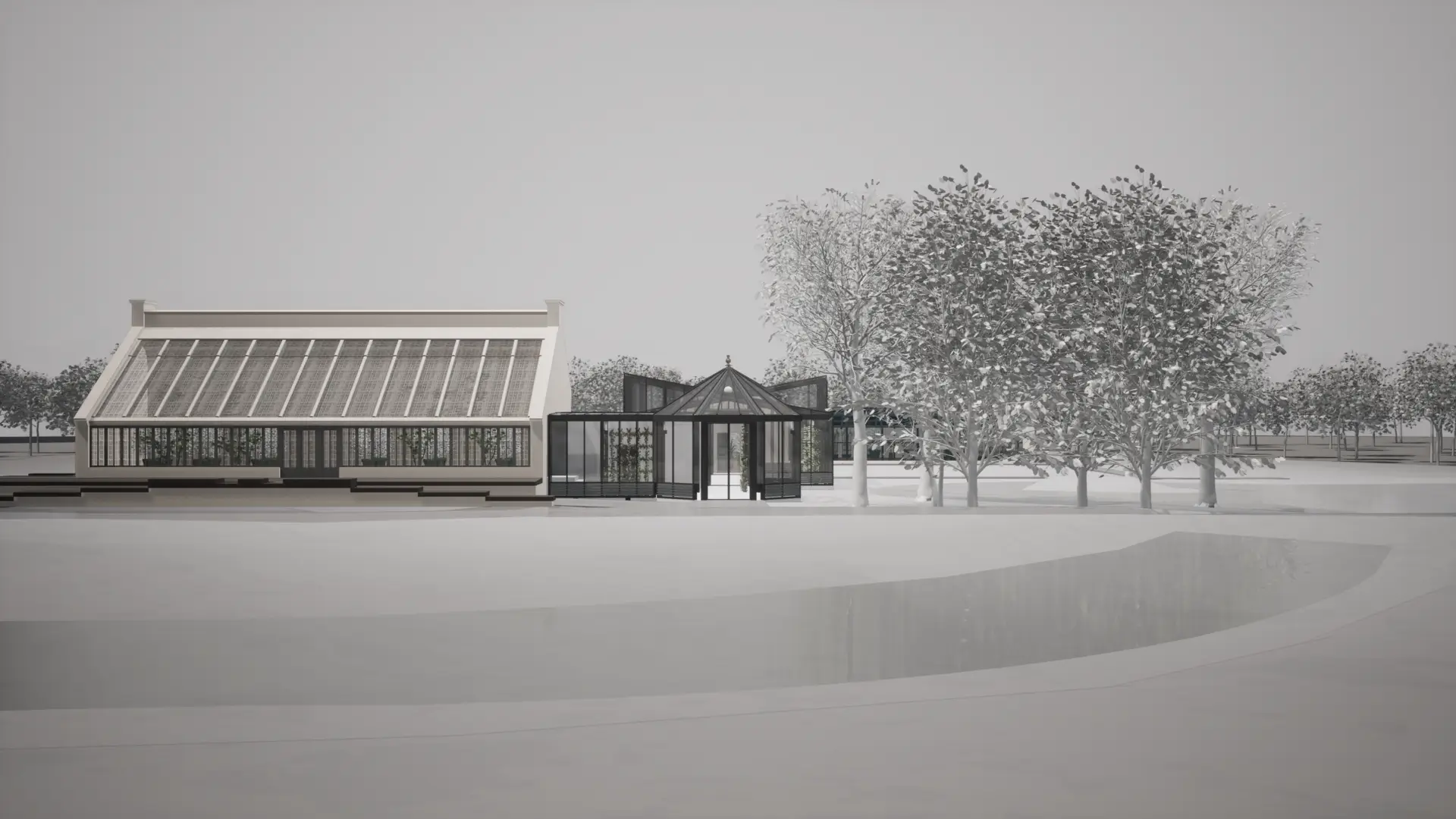 The connection between the Vermehrungshaus and the Blaues Haus is formed by a cantilevered roof, which avoids any structural interference with the existing building. Beneath this roof, a covered passageway links the area around the Blumensee with the Gartencafé in an open and inviting way. The new building will primarily function as a greenhouse, but during the summer months it will also provide space for smaller events, exhibitions, and presentations. The passage between the Vermehrungshaus and the Blaues Haus is designed to serve as a suitable main entrance for such occasions.